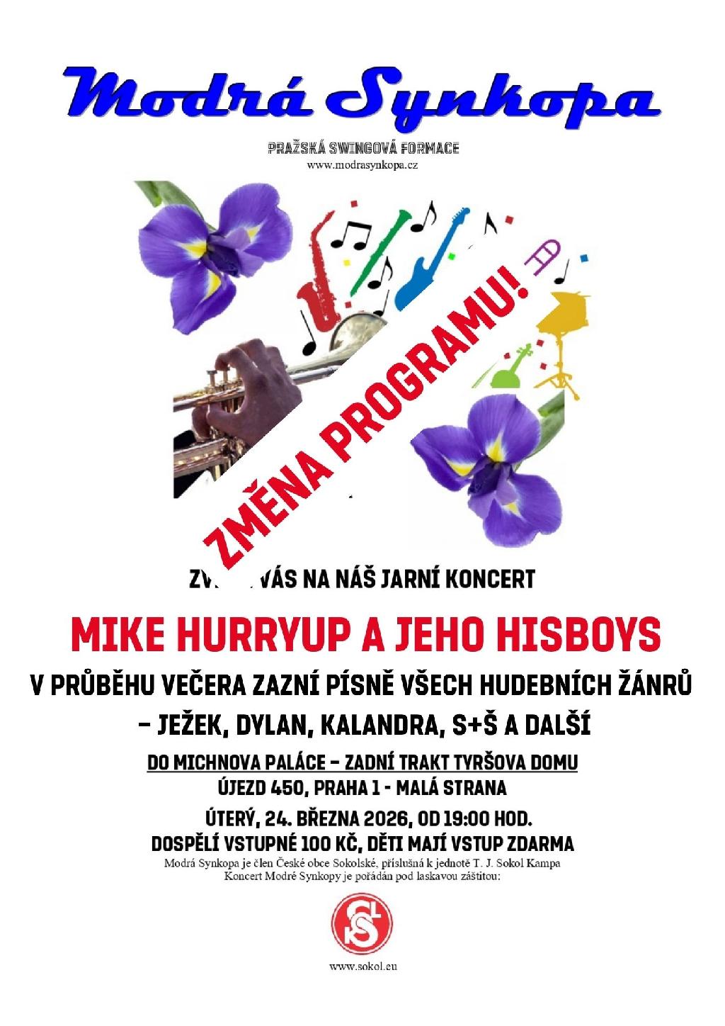 V úterý 24. 3. 2026 od 19:00 vystoupí v Michnově paláci místo Pražské swingové formace Modrá Synkopa MIKE HURRYUP a jeho HISBOYS.
